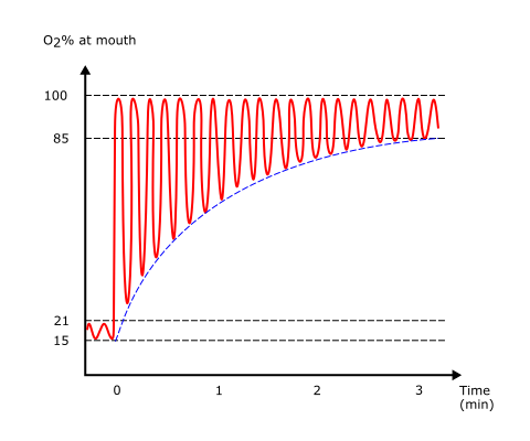 Three minutes of tidal breathing are required. The shallower breaths take longer to raise the O2 concentration in the alveoli but is normally more pleasant for the patient (Fig 1).