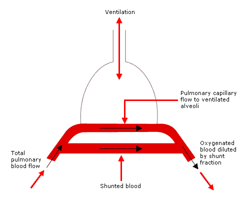 Ventilation/perfusion mismatch causing shunt. V/Q mismatch results when ventilation of areas of the lung is inadequate to fully oxygenate blood flow. Shunting occurs when blood passes though areas of the lungs that have no ventilation. Causes include, alveolar collapse and bronchial intubation.