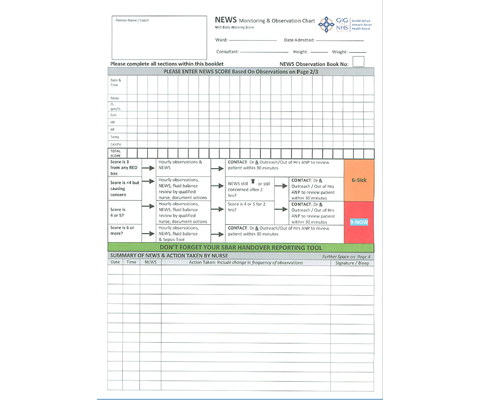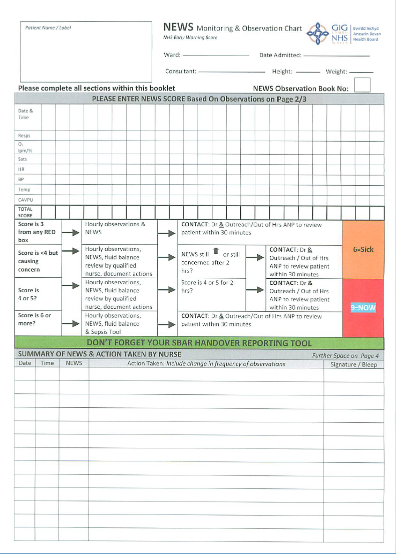 Pulse, blood pressure, respiratory rate, oxygen saturation, conscious level, urine output and pain score should be recorded.