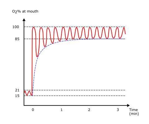 Within four breaths the alveolar concentration has almost reached the plateau concentration of ~85% O2