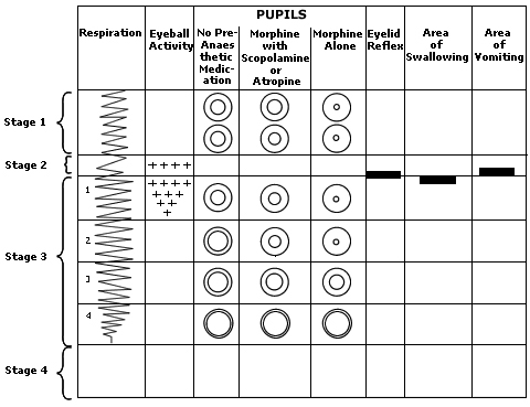 This is the stage of medullary paralysis and overdose. It stretches from the onset of diaphragmatic paralysis to apnoea and death. At this stage, all reflex activity is lost and the pupils are widely dilated.