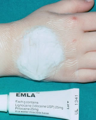 | Topical anaesthetic creams such as can Ametop (amethocaine) EMLA (lignocaine/prilocaine), or ethyl chloride spray can be very effective in reducing the pain of cannulation. |