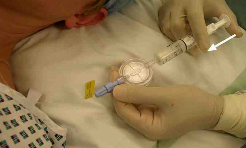 The catheter is held upright and a fluid level sought. If the catheter is then elevated, the fluid level should fall (see inset) as the fluid siphons in to the epidural space, which is usually under negative pressure compared with atmospheric. If the fluid column continues to rise, this may suggest subarachnoid placement. The siphon test can be reassuring, but is not mandatory.