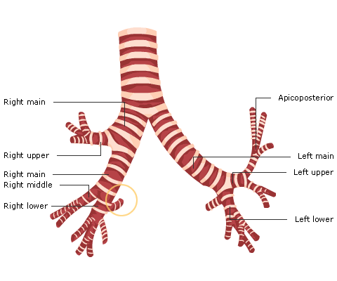 Aspiration is more likely to occur into the right side than the left. The apical bronchus of the right lower lobe is the first segmental bronchus to arise posteriorly, as highlighted in the image, and is most commonly affected in the supine patient.